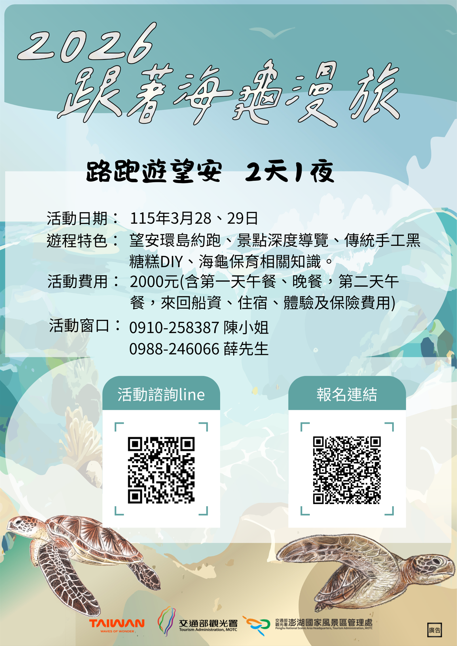 望安昔稱八罩嶼,涵括南方四島,位於澎湖群島南方,經劃設全國唯一的綠蠵龜產卵棲地保護區,亦是少數僅存每年均有綠蠵龜穩定洄游至沙灘產卵地點;且在地對於海龜保育的理念更可透過「好善堂」石碑紀載追溯百年以前,也因此有「綠蠵龜故鄉」之稱。交通部觀光署澎湖國家風景區管理處(以下簡稱澎管處)為推廣望安鄉深度旅遊發展並落實生態永續觀光,結合在地獨特的玄武岩地景、花宅聚落、綠蠵龜生態、手作體驗及潮間帶、水域活動體驗等多項資源,打造兼具生態教育與永續理念的主題遊程;首場「隨著海龜深度漫遊望安」的約跑活動,將於3月28日至29日登場,透過結合運動休閒、生態教育與人文走讀,開啟望安觀光新體驗。