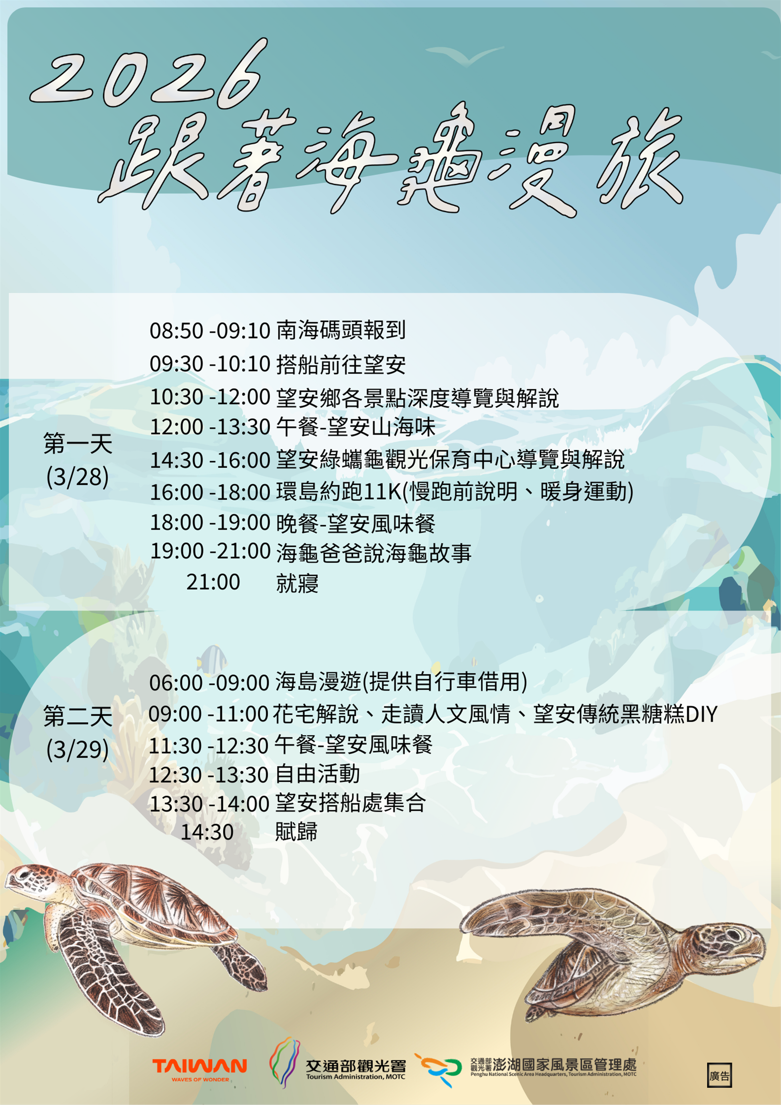 首場活動為2天1夜,以不競速、低強度的環島公路(11k)路跑為主軸,沿途串聯多個望安鄉著名景點,包含擁有戰地遺跡的鴛鴦窟、在地信仰中心水垵李王宮、登高望遠的天台山、百年歷史的花宅聚落,以及綠蠵龜的產卵棲地網垵口沙灘,起伏有致的地形讓跑友能深刻感受澎湖獨有的破風體驗與遼闊海景。除了熱血約跑,還有安排深度的文化與生態體驗,並邀請台灣愛龜協會理事長(海龜爸爸)陳久林先生,親自解說海龜保育、救傷、餵食或觀察沙灘爬行的痕跡等專業的知識,以及多年來的保育成果,讓遊客在參與過程中,深化對海洋生態保育與永續旅遊的認識。