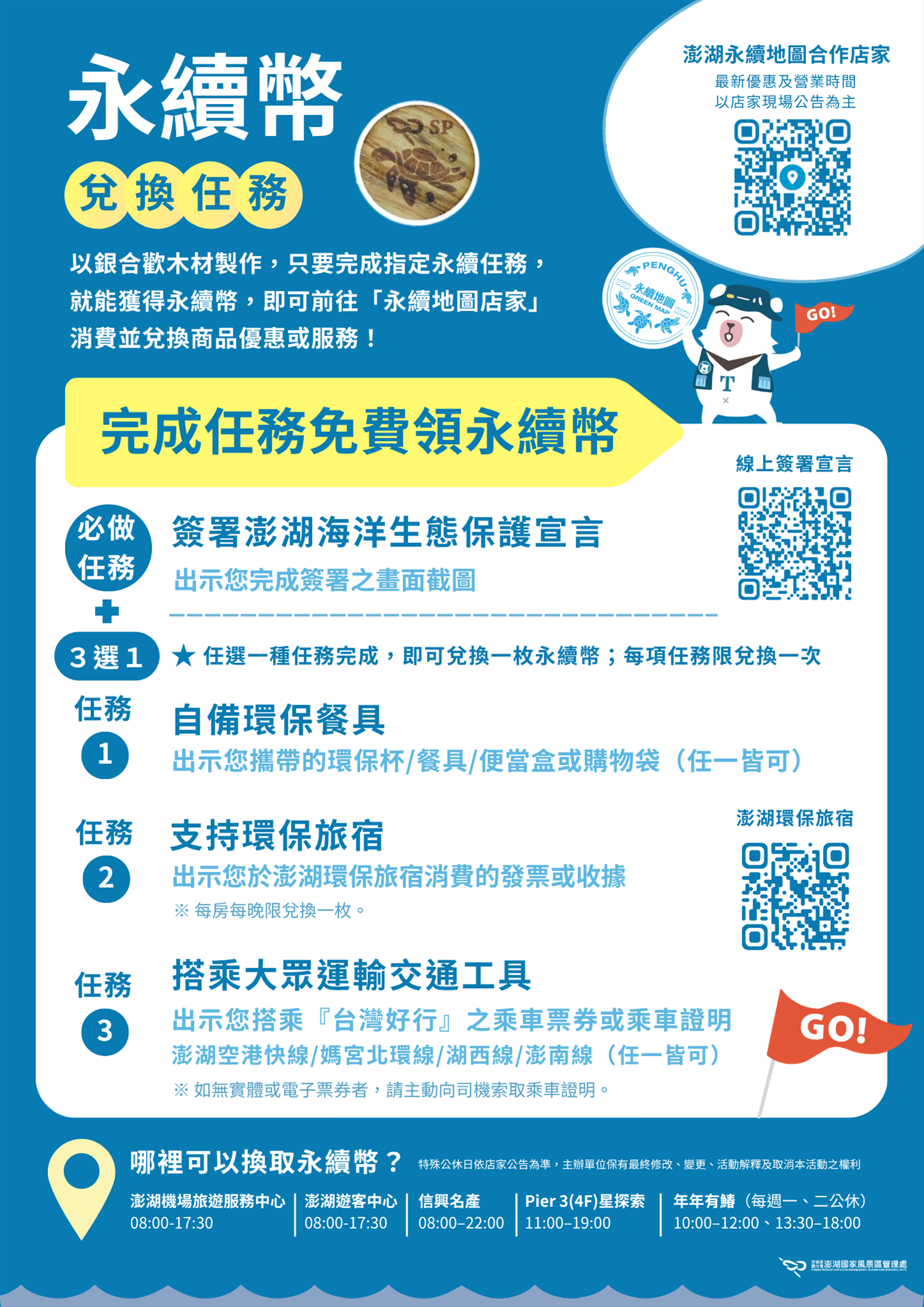 澎管處表示,民眾只要在活動期間完成簽署「澎湖海洋生態保護宣言」,並完成以下任何一項「永續任務」(三選一),即可憑相關證明至指定地點兌換永續幣: