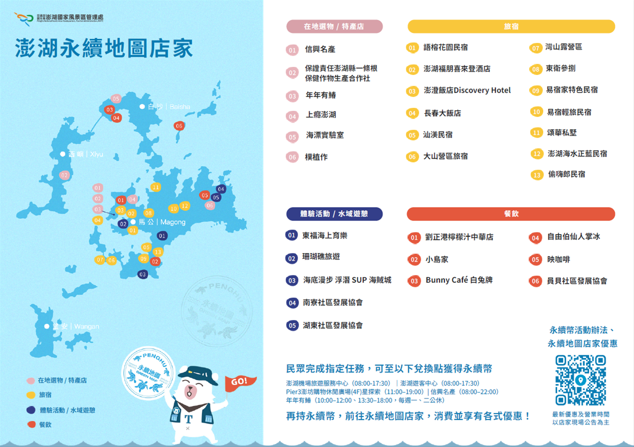 年年有鰆(澎湖縣馬公市臨海路4號;0905-722145)澎湖長年受外來種植物銀合歡肆虐,其耐旱與排他性對在地生態造成威脅。為此,澎管處特別規劃以銀合歡打造「永續幣」,將環境問題轉化為旅遊動力。民眾凡實踐永續行為即可領取永續幣,並前往「澎湖永續地圖」合作店家消費,享受實質回饋,藉此讓支持永續的民眾與店家達成互惠雙贏。