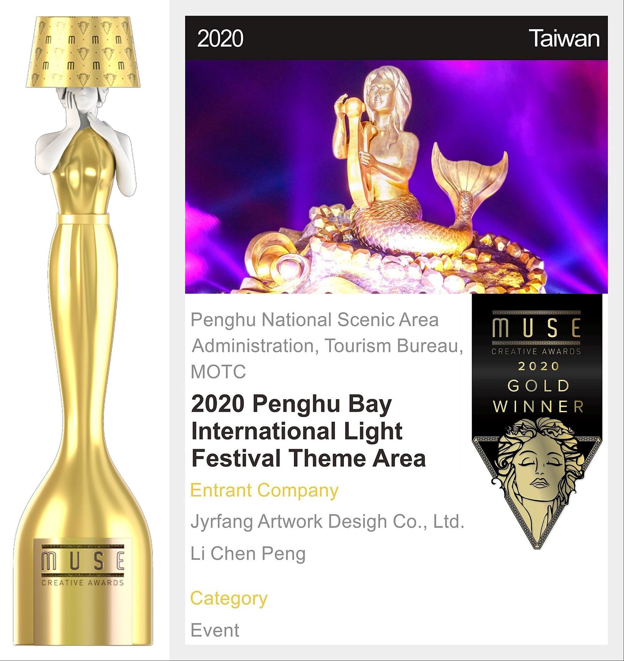 根據IAA國際官方公布報導指出,今年度參與獎項角逐之作品分別來自全球57個國家,總參賽作品高達4918件,於全球參與展場活動類角逐競賽之結果總計頒發獎項包含4項白金獎(土耳其1件、美國3件)、7項金獎(台灣1件、加拿大1件、香港1件、美國4件)、7項銀獎(美國7件),又以今年度全球受到新冠肺炎Covid-19的影響,大型展場活動的舉行更加具有難度,全球角逐獎項之國家皆須受到國際評審團更高規範的審視方能勝出。MUSE設計大獎素有國際設計界重大文化表彰指標之美譽,該獎項旨於發掘對創意設計與文化連結之核心價值為重之優秀設計作品,並予以全球公開表揚,今年澎湖國際海灣燈光節主題燈區以「海島人文」為參賽主題,著重燈光節舉辦背後對於觀光、經濟、在地文化以及海洋資源保護之省思,使燈光節活動更超越了一般常見之民間藝文展出,讓在澎湖點亮的光點成為2020年全台唯一於該參賽類別獲頒獎項之殊榮紀錄,表彰於國際舞台!