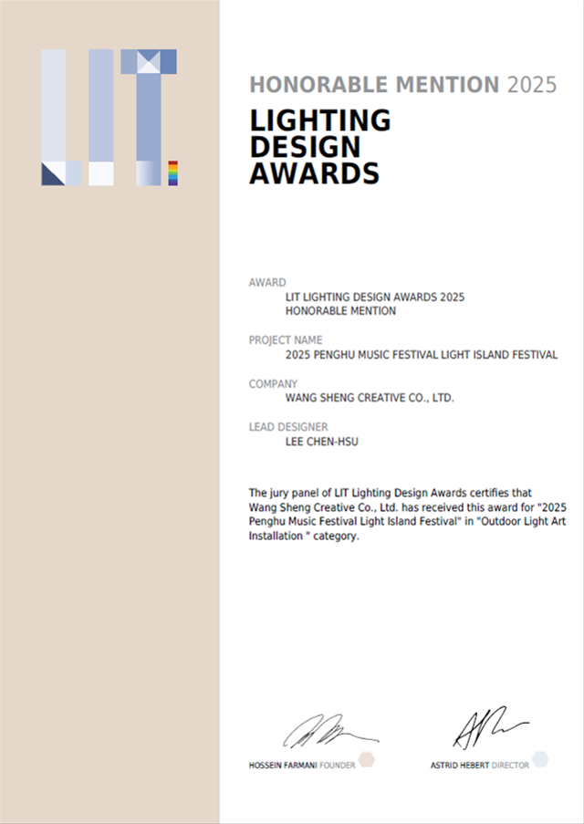 交通部観光署澎湖国家風景区管理処(以下澎管処)が主催する「2025澎湖風を追うミュージックイルミネーションフェスティバル」は、地域文化の蓄積と空間全体の美学を融合したライトアートにより、近年国際的なデザイン舞台で相次いで受賞の朗報を伝えています。今回のライトアート展「光の島の盛典」は、「ロンドンデザイン賞(LONDON DESIGN AWARDS)金賞」、「フランスデザイン賞(French Design Awards)金賞」および「スイス照明デザイン賞(LIT Lighting Design Awards)特別賞」を一挙に受賞し、澎湖独自の自然景観と文化的魅力を再び国際舞台へと押し上げるとともに、台湾の照明アート創作における卓越した実力を示しました。