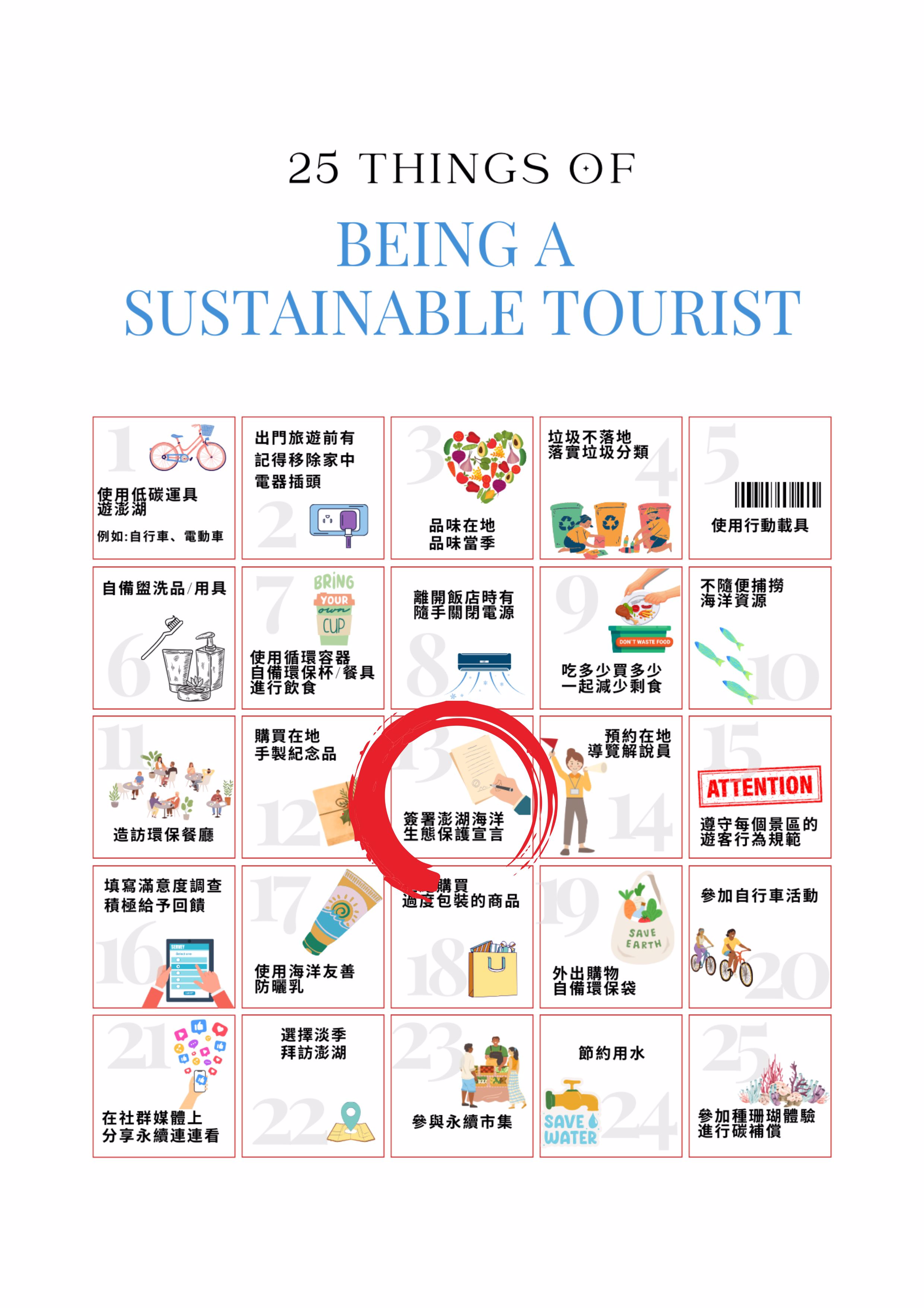 🌟 那來到澎湖旅遊,我們希望遊客可以一同進行的責任有什麼呢?一起來看看專屬澎湖的永續旅人賓果連連看吧!