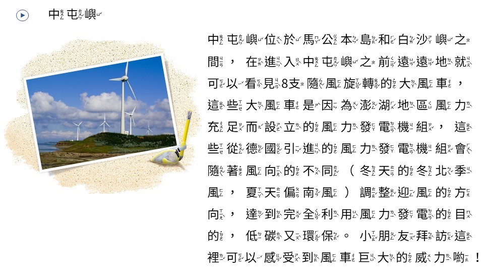 - 中屯嶼:中屯嶼位於馬公本島和白沙嶼之間,在進入中屯嶼之前遠遠地就可以看見8支隨風旋轉的大風車,這些大風車是因為澎湖地區風力充足而設立的風力發電機組,這些從德國引進的風力發電機組會隨著風向的不同(冬天的冬北季風,夏天偏南風)調整迎風的方向,達到完全利用風力發電的目的,低碳又環保。小朋友拜訪這裡可以感受到風車巨大的威力喲!