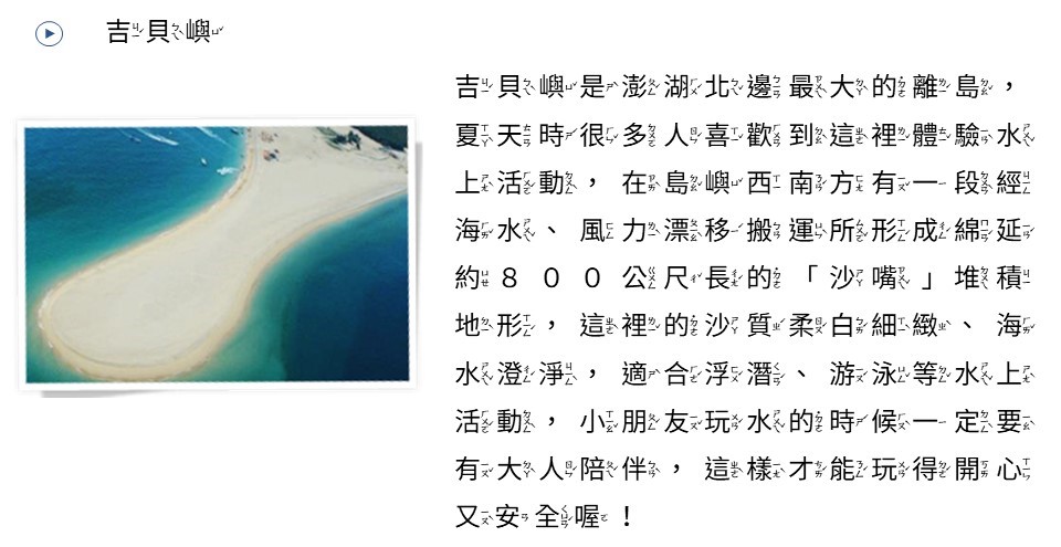 - 吉貝嶼:吉貝嶼是澎湖北邊最大的離島,夏天時很多人喜歡到這裡體驗水上活動,在島嶼西南方有一段經海水、風力漂移搬運所形成綿延約800公尺長的「沙嘴」堆積地形,這裡的沙質柔白細緻、海水澄淨,適合浮潛、游泳等水上活動,小朋友玩水的時候一定要有大人陪伴,這樣才能玩得開心又安全喔!